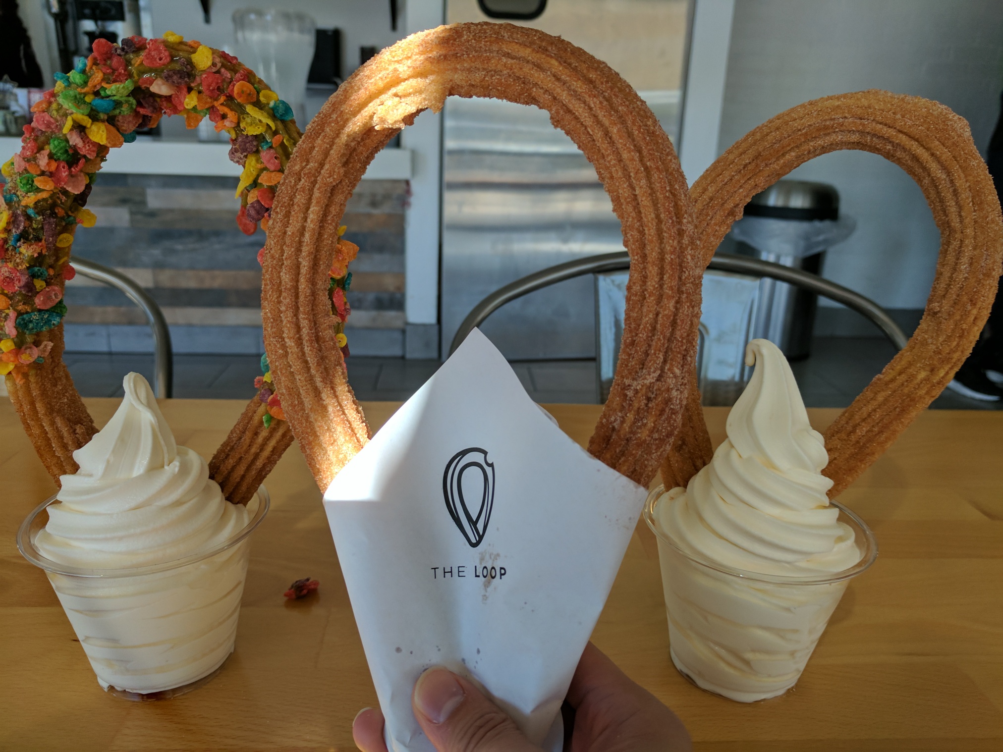 This was my flavor choice at the loop. Matcha green tea with fruity pebbles and soft serve. Definitely splurge on adding some soft serve to balance out the churro. Texture and balance is key my friends!